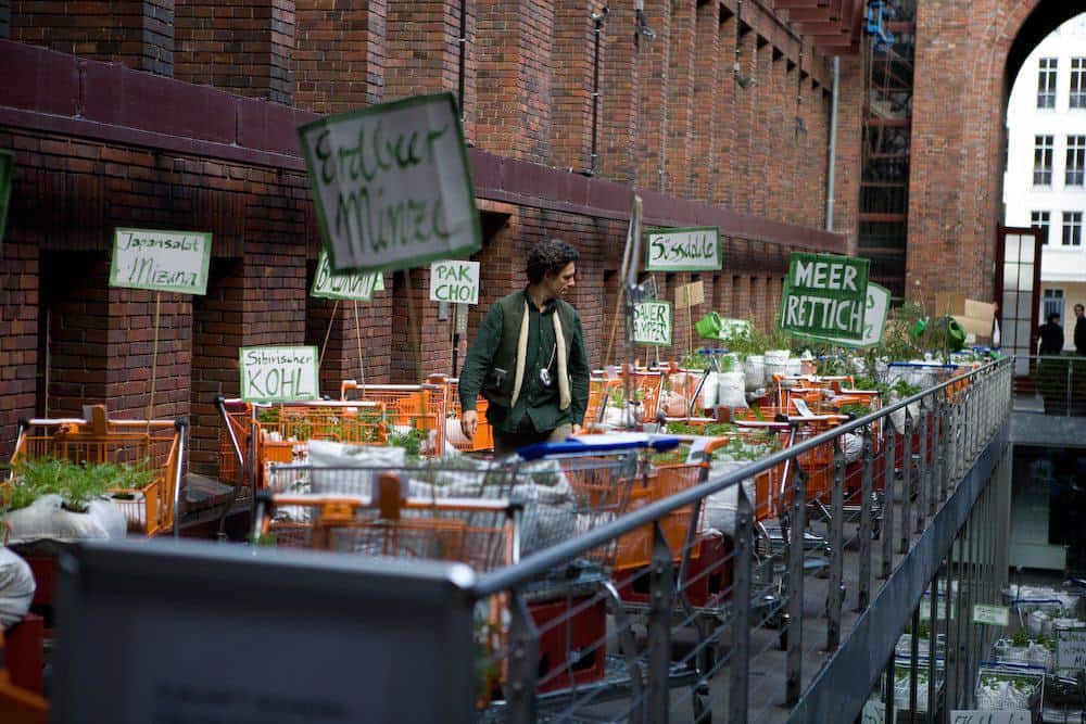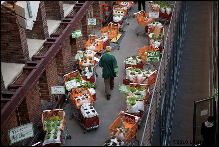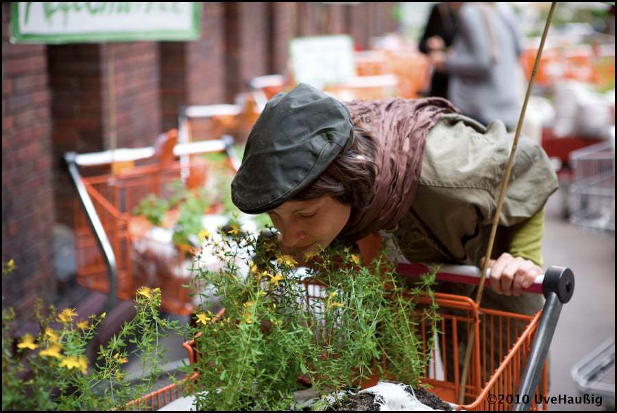 Deshalb suchten wir Leute, die mit uns zusammen 100 Einkaufswagen, gefüllt mit verschiedenen Nutzpflanzen und Kräutern, vom Umspannwerk in der Ohlauer Str. zum Moritzplatz quer durch x-Berg schieben wollten. Jede Pflanzeinheit wurde mit einem Transpi geschmückt, damit nicht nur die Tagungsteilnehmer, sondern auch die Passanten und Medien auf das Thema aufmerksam gemacht wurden!